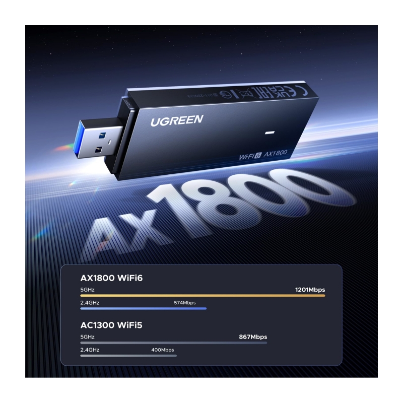 WIFI ადაპტერი UGREEN 65225 AX1800, 1201Mbps, USB Wifi6 Adapter, Black