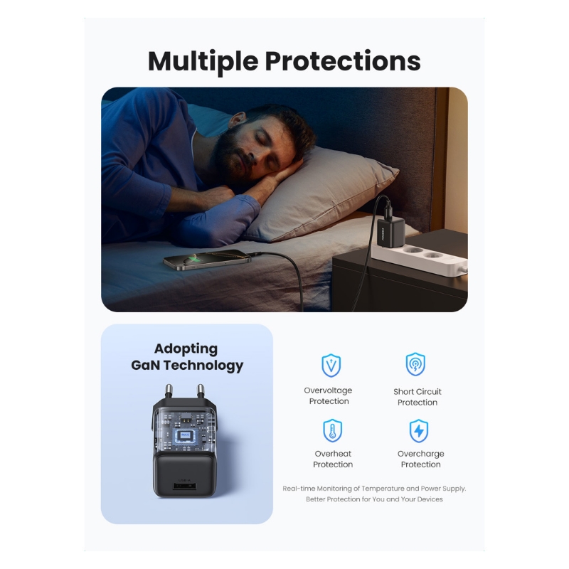 - USB-A QC3.0 (3.6V-12V, 18W), QC2.0 (9V/12V, 18W), AFC (9V, მაქს. 15W),